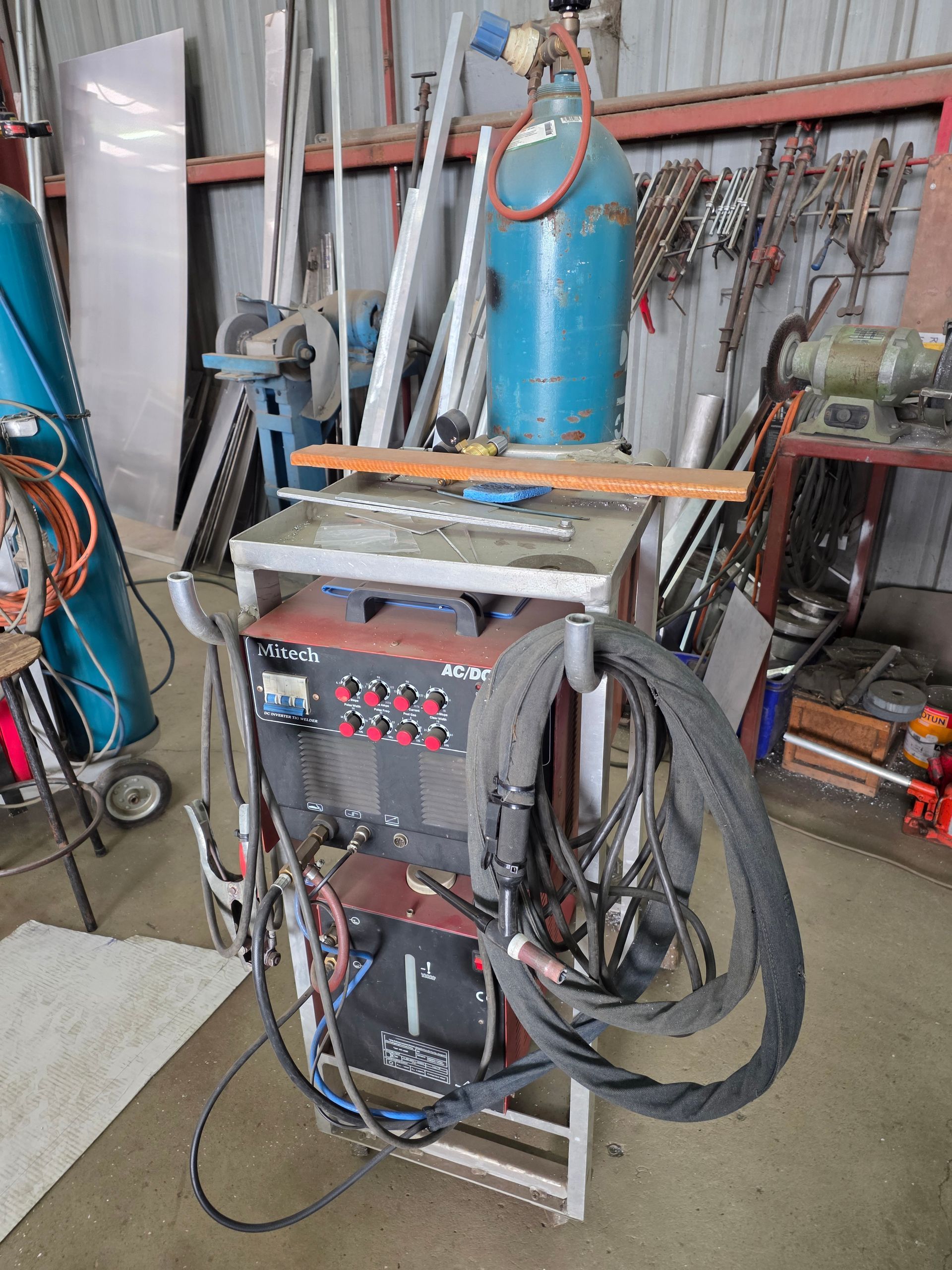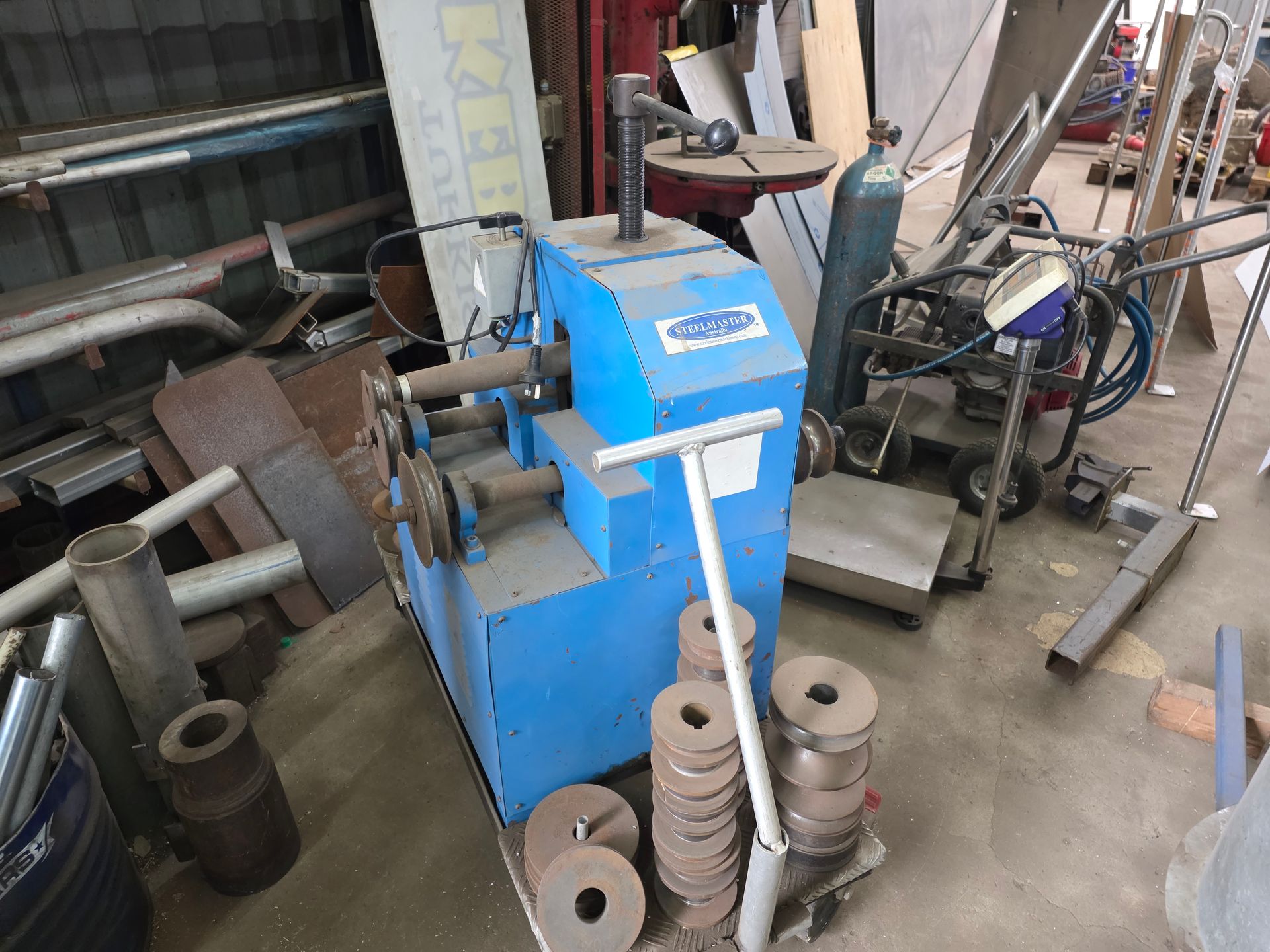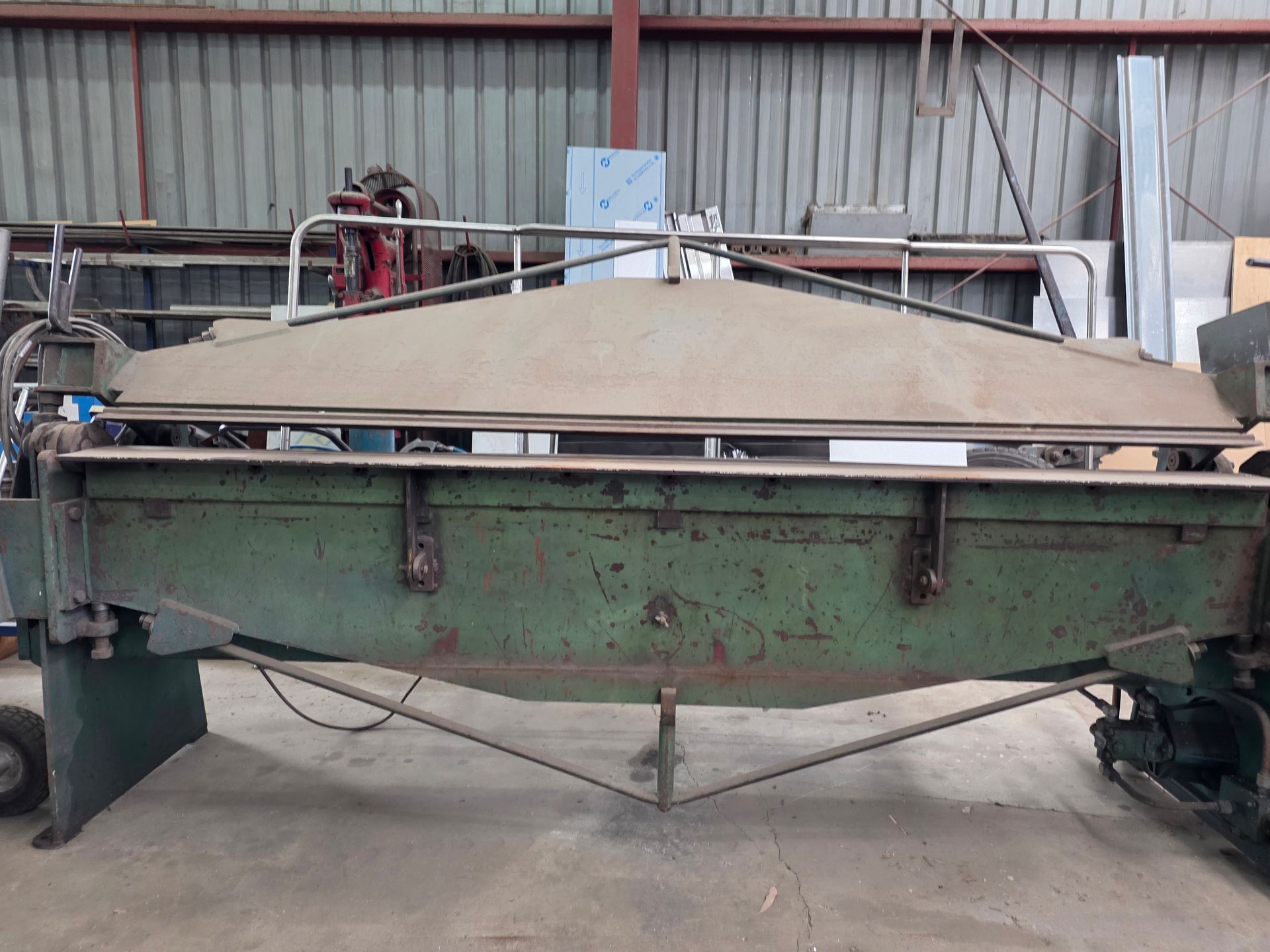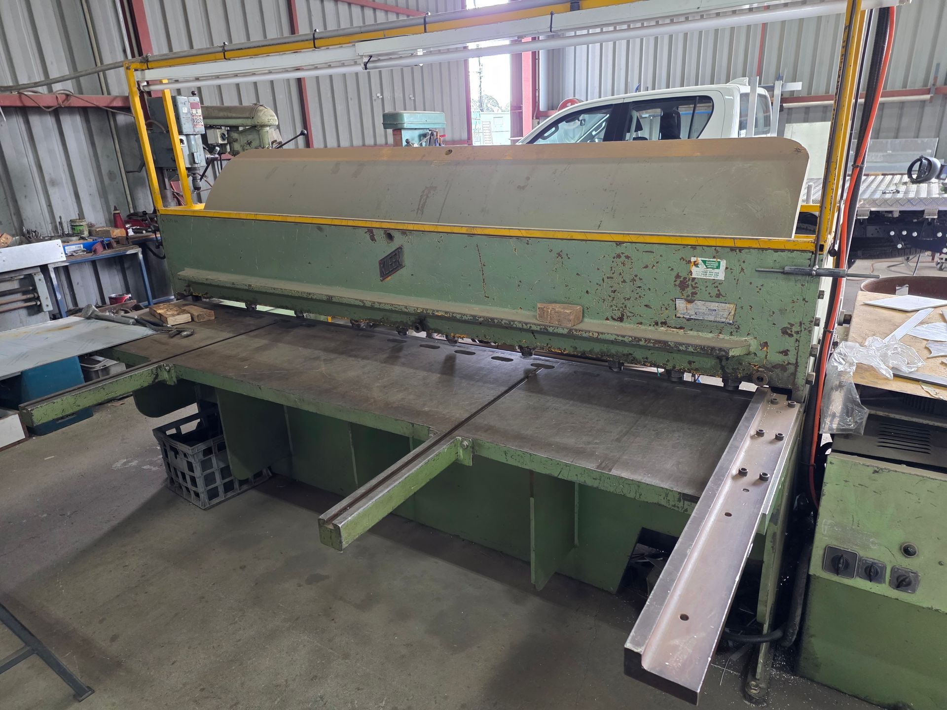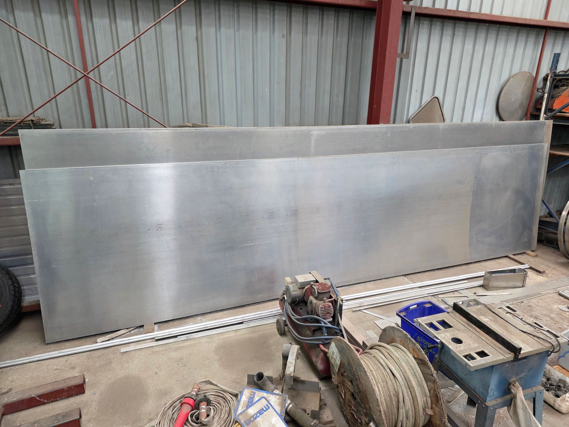 9 sheets Aluminium 5083 grade [6.1L 5mm, 6mm & 1/4”]; BOC EWM Mig welder [never used]; BOC plasma cutter; Mitech AC/DC water cooled 3ph Tig welder; Sheraton lathe; Steelmaster combo roller; Whichman combo notching guillotine; 2 x Fronius TPS 2700 mig welders; Weely roller; 8ft hydro metal bender;8ft Iredale hydro guillotine; Kleen 8ft hydro guillotine; Epic 3m metal folder; hand angle cutter guillotine; hydro pipe bender 3ph; Unique tube bender; Weldarc WIA tig welder; CIG transarc pulse welder; Ausmig welder 3ph; ASB welder; Country 240v des gen; RSM 4350psi pressure washer; pressure washer 3ph; Selson Engineering pedestal drill; Millers Falls bench drill; Servian pedestal drill; Vail aumin bandsaw; alumin bandsaw; H.D. pedestal grinder; Parken sander linisher; Linisher 3ph; 12” cut off where 3ph; Cummins des 1500rpm & Mecc Alte Spar 13.5kva 3ph gen; Perkins 3cyl des motor; 2 Holden red motors; 3 BorgWarner marine gear boxes 1.5 ratio; 3 hydraulic pumps; 50t? trolley jack; anvil on pedestal; 6 block & tackles; electric scales; 2 industry exhaust fans; 1.8m plate roller; & oodles of tools & sundries;